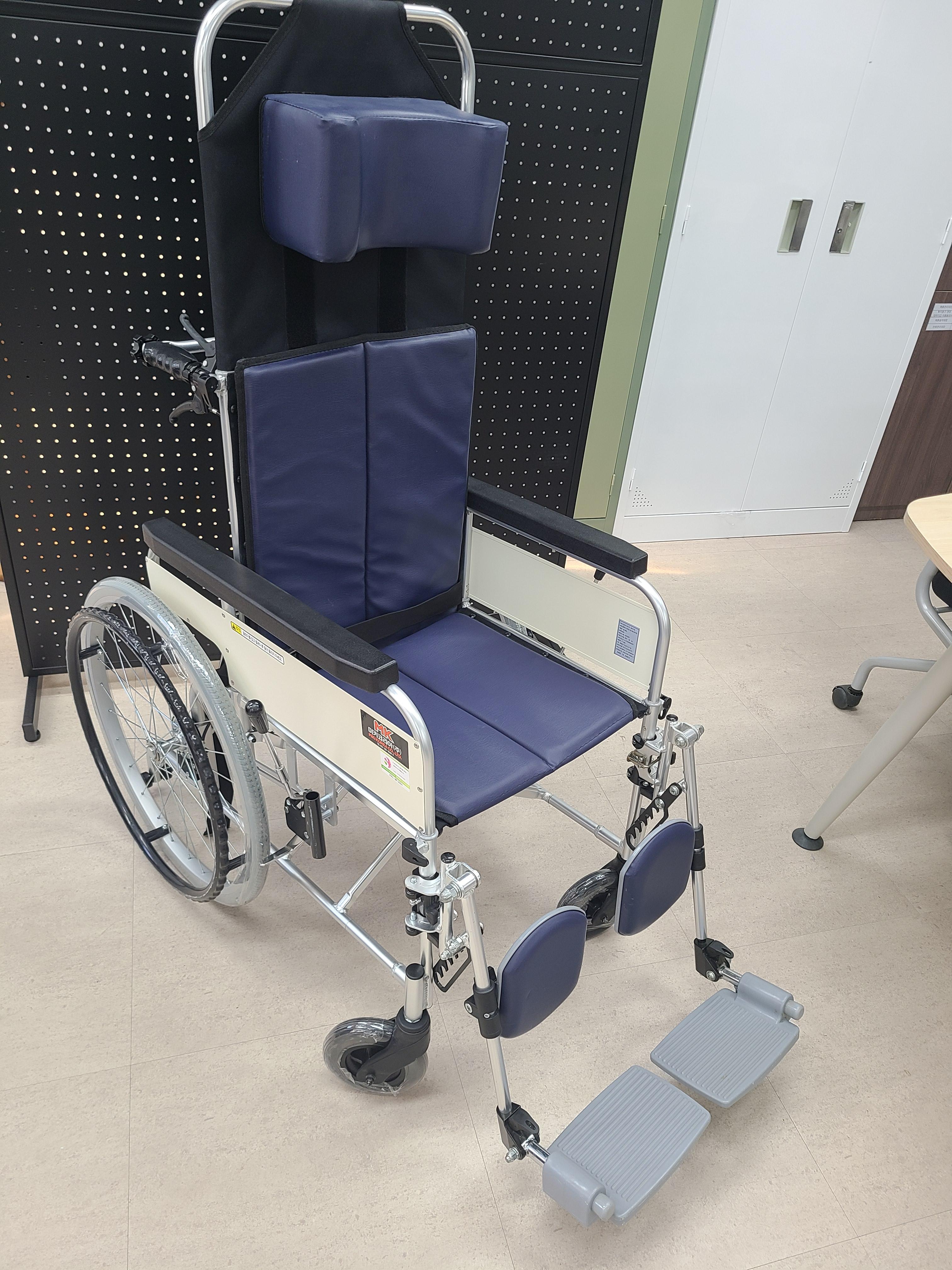 다리를 올릴 수 있는 휠체어입니다.