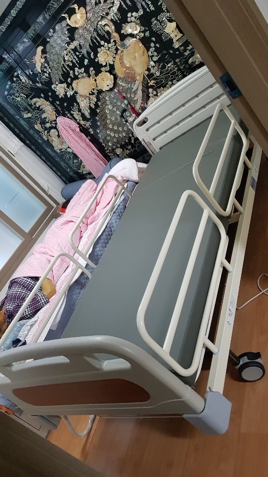 설치를 해 드린 모델은 침대에 접이식 식탁이 있어 상체 각도를 세우고 식사나 투약 등이 가능하시고