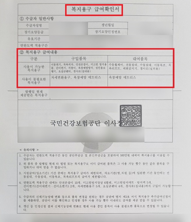 전동침대 지원 가능 여부는 공단 서류 중 '복지용구 급여확인서'에서 확인 가능하고, 본인부담률은 '개인별 장기요양 이용계획서'에서 확인 가능합니다.