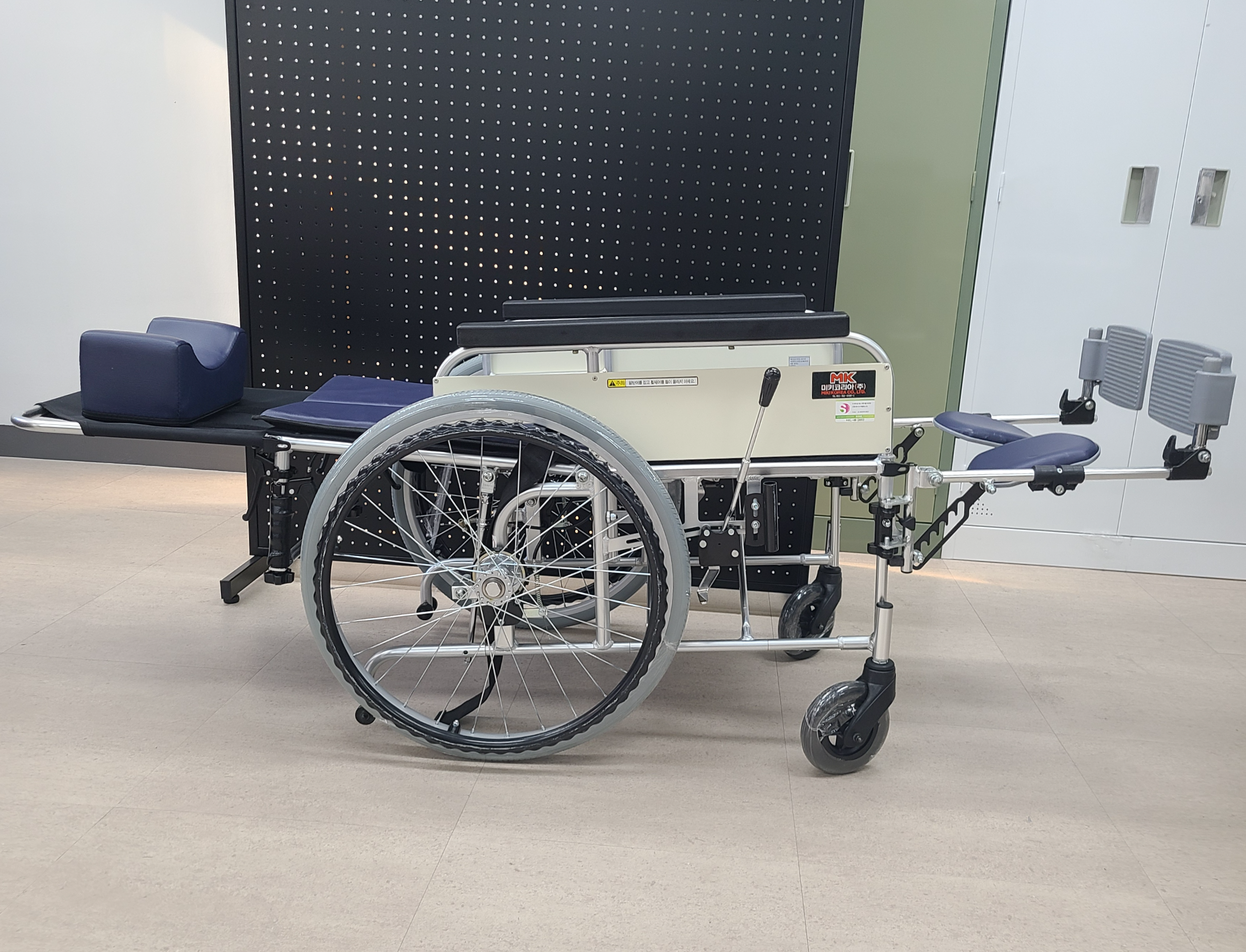 거상형(침대형) : 상체 각도 및 하체 각도를 각각 원하는 만큼 조절 가능 (침대형 휠체어)
