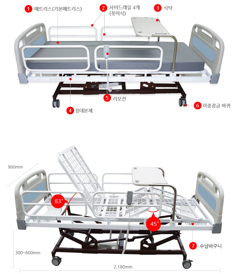 병원에서 사용하셨던 침대와 동일하게 리모컨으로 상. 하체 각도 조절은 물론, 침대 전체 높낮이 조절이 가능합니다.